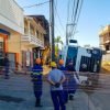 Caminhão da prefeitura tomba sobre calçada, no Centro