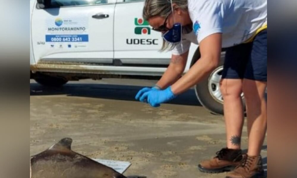 Uma toninha foi encontrada cortada ao meio na Praia do Sol, em Laguna, nesta terça-feira (28). O animal foi levado pela equipe do Projeto de Monitoramento de Praias da Bacia de Santos para a Unidade de Estabilização de Fauna Marinha da Udesc, onde veterinários irão analisar o caso.