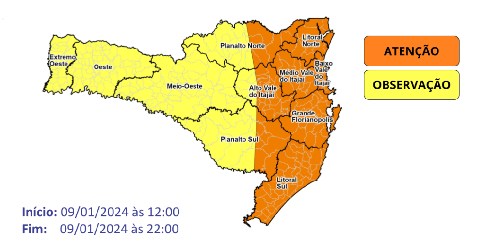 A Defesa Civil de Santa Catarina alertou sobre a possibilidade de chuvas volumosas e temporais a partir desta terça-feira (9). Áreas como o Sul do estado e regiões litorâneas aparecem como risco alto para danos como destelhamentos, queda de árvores e danos na rede elétrica.
